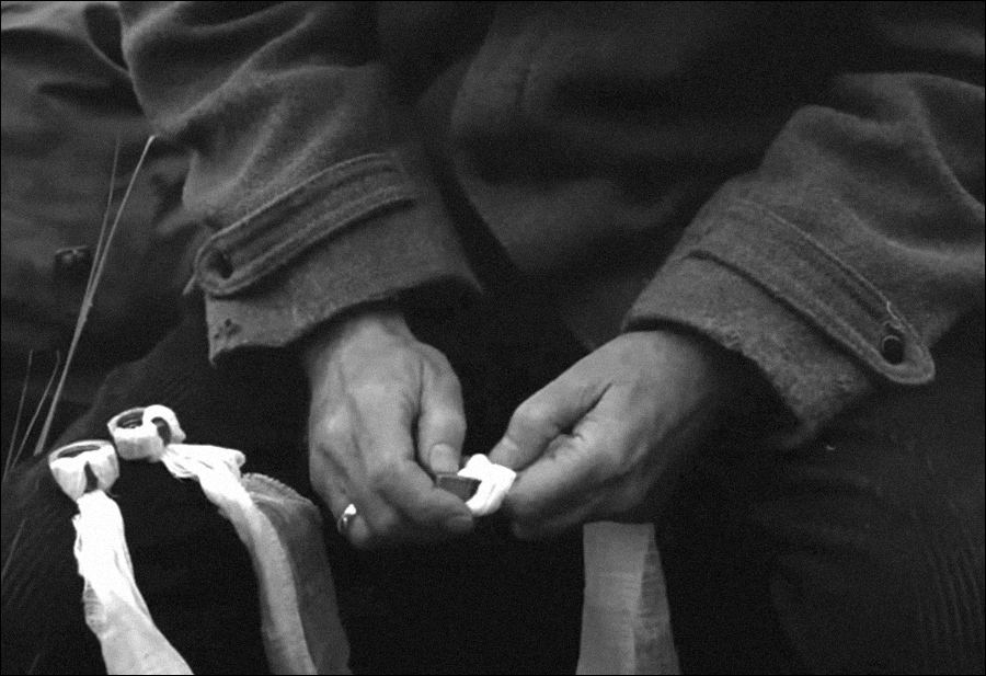 Profesorul trecând fâșiile de pansament prin piulițele încredințate de Călăuză (minutul 47)