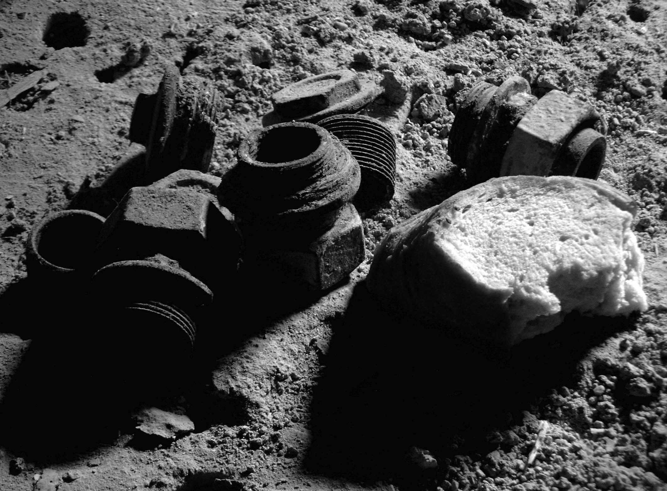 Într-o după masă de duminică, am urcat în turnul clopotniței, iar acolo am găsit aceste piulițe, dopuri și manșoane filetate, lângă care era aruncată pe jos o cârmoajă îmbucată de pâine, căzută probabil de pe la mesele muncitorilor.