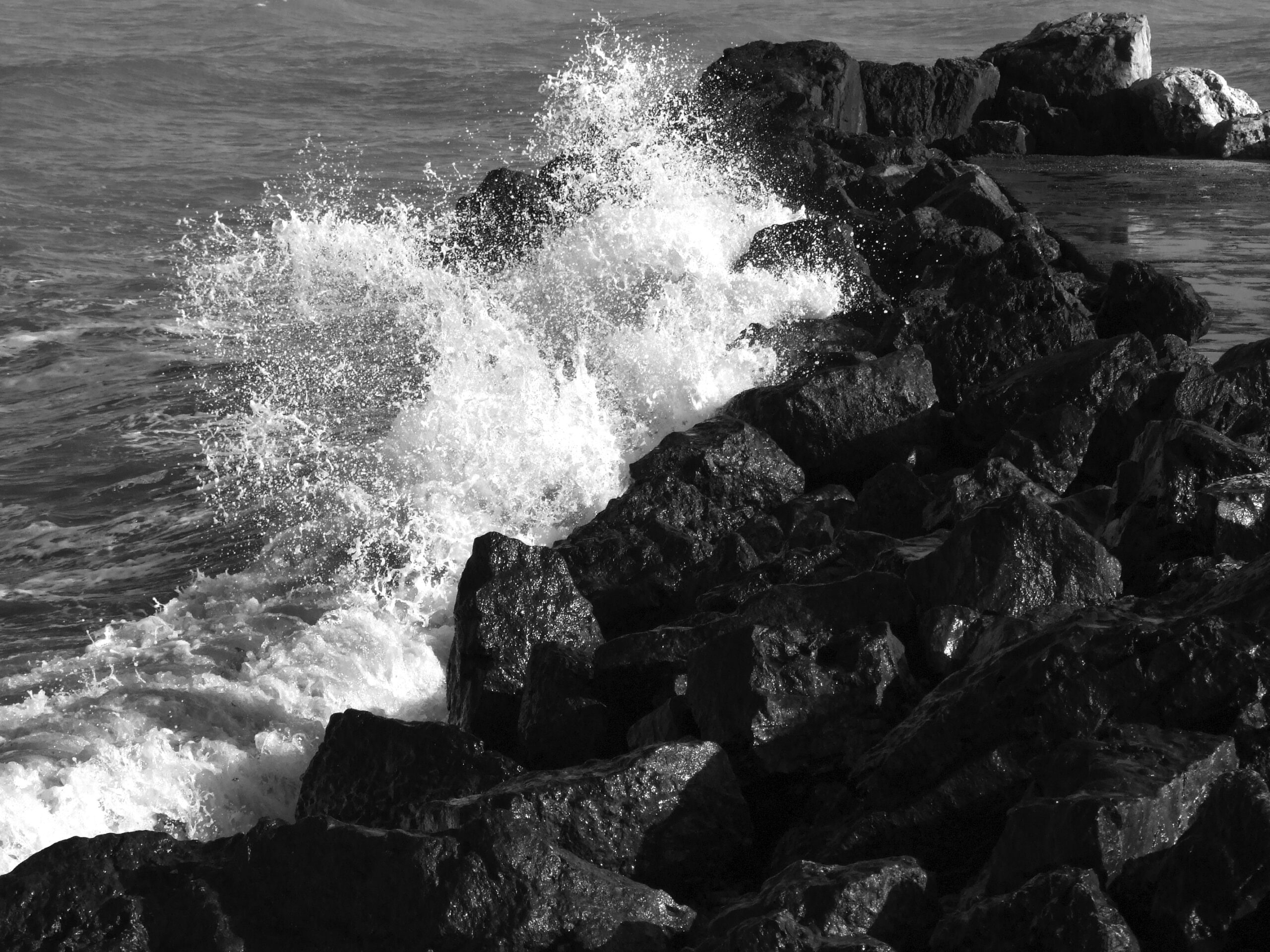 Într-una din zilele cu vânt mai puternic și valuri înalte, am rămas pe țărmul mării până spre amiază, deoarece lumina soarelui și cerul senin de primăvară deveniseră foarte îmbietoare pentru a face fotografii. Nu mă mai săturam să urmăresc spargerea valurilor de țărmul pietros, iar la răstimpuri mai fotografiam zbuciumul de sfârșit al vreunui val, care se împrăștia maiestuos peste rocile neclintite. Folosindu-mă de faptul că lumina era puternică, am redus timpul de expunere și astfel mulțimea de stropi frânți ai valurilor rămâneau „suspendați” în cadrul fotografic.