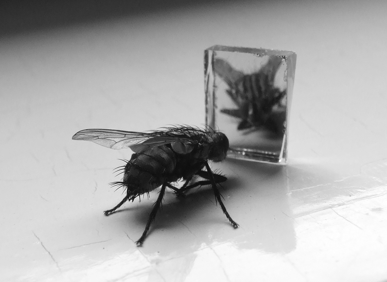într-o vreme am purtat cu mine, în geanta aparatului de fotografiat, o bucățică de oglindă. Nădăjduiam ca, la un moment dat, să găsesc ceva potrivit pentru oglindire în acel ciob dreptunghiular. Odată s-a întâmplat să ajung în vizită la cineva care nu locuise un răstimp mai îndelungat în oraș și tocmai se întorsese acasă. La una dintre ferestrele unei camere, se aflau pe pervazul interior o armată de muște moarte. Cu permisiunea gazdei, care era puțin jenată, am început să privesc mai atent cohorta de muște de diverse mărimi, care se odihnea definitiv în bătaia soarelui. Pentru că erau foarte multe la îndemână, am ales musca uscată care se conservase cel mai bine și… mai fotogenic. Iat-o așadar fotografiată aici!
